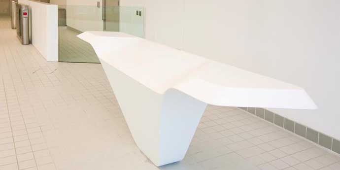 Kevin Hoy continues, “The desk is a great example of how Corian® can create a monolithic sculptural installation which also offers a strong, lasting finish that’s easy to maintain, and is even repairable, if necessary. This is especially important in terms of the levels of public interaction that will happen in the Aquatics Centre, which, ultimately, is there to serve the community for the long term.”